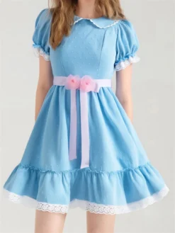 Women Sweet Mini A Line Dress Short Puff Sleeve Doll Collar Lace Patchwork Dress with Floral Belt